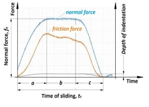 Peak normal force, impact duration and frequency are specified as test inputs. Longitudinal friction force and indenter penetration are monitored during the test.