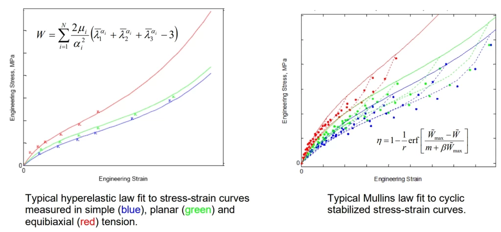 The Hyperelastic Module produces the basic information about nonlinear stress-strain behavior that is needed to run a finite element model and to represent initial transient softening (Mullins effect) in the model.